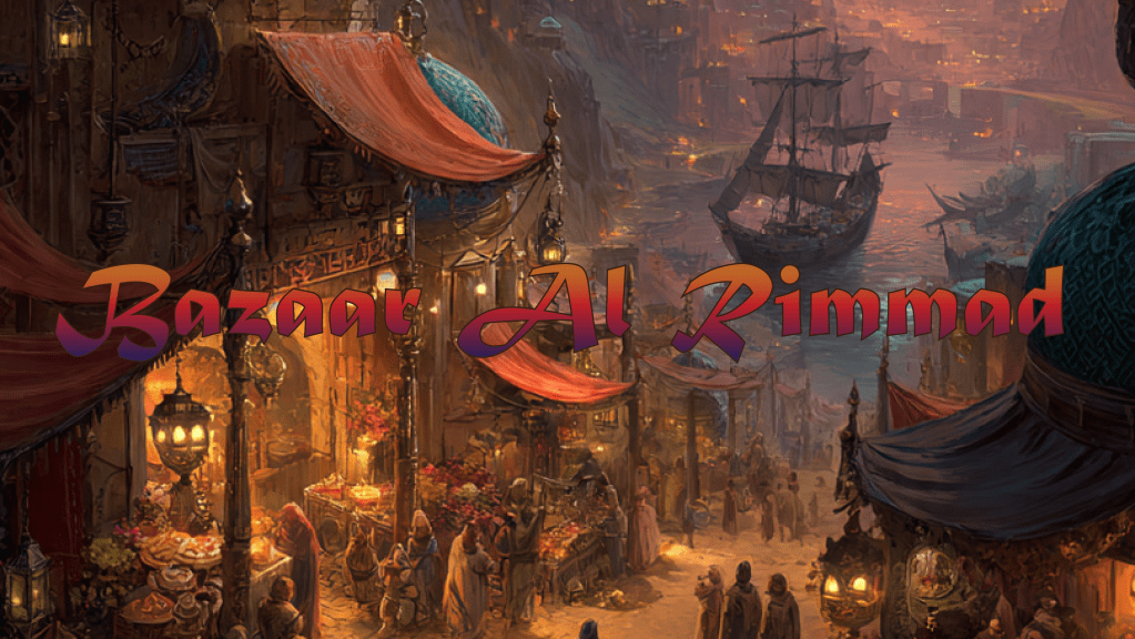 A thriving port city on the Darogi Gulf. Al Rimmad is a haven for everything and everyone, if they’ve the coin to spend there. Through narrow alleys and crowded markets, the likes of merchants and smithies, bankers and swindlers converge on the sun-baked streets of Al Rimmad. On the wharf a swarm of buzzards tear at an overturned fruit cart, unconcerned with the sailors heckling passerby.