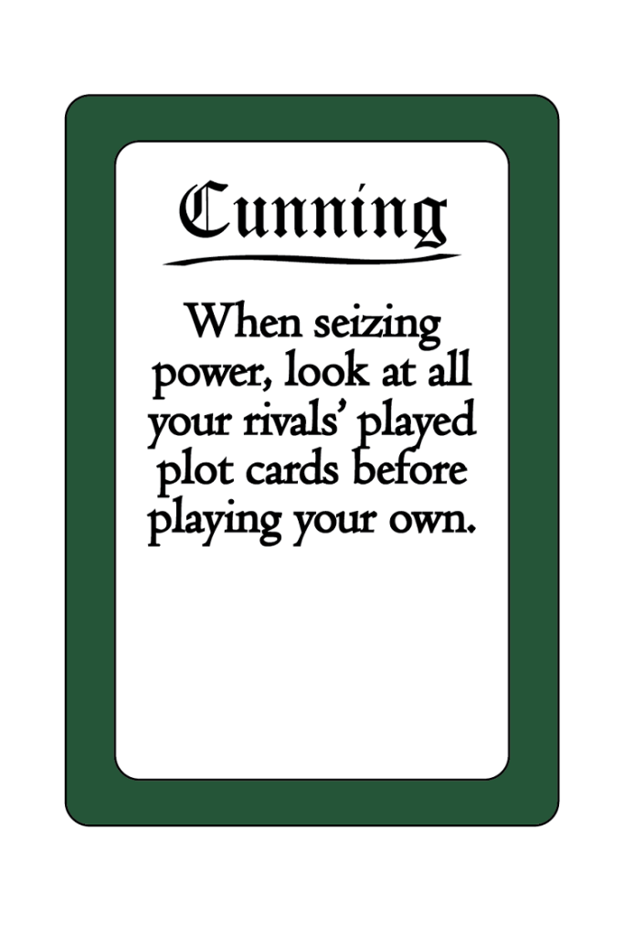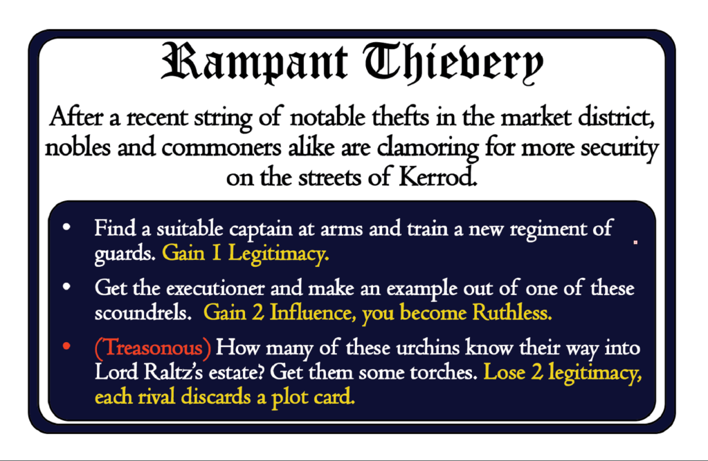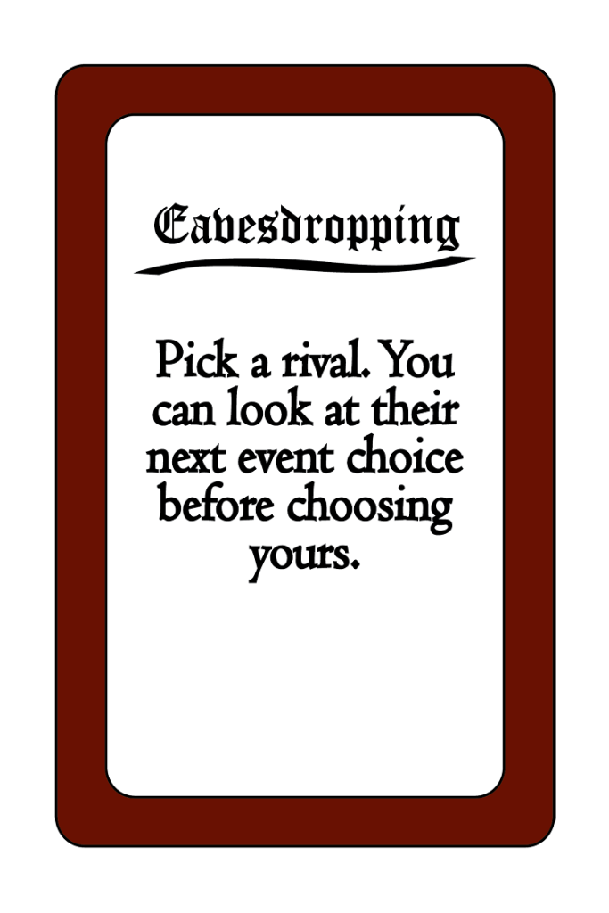 Players! Welcome to the Regency Council of Castle Kerrod! After the late King Renalt’s mysterious death, you are the only hope for this struggling kingdom. You will vie for Legitimacy and Influence with your fellow council members in a bid to seize power before your rivals can do the same. So, will you bring Kerrod to glory, or seek it for yourself?