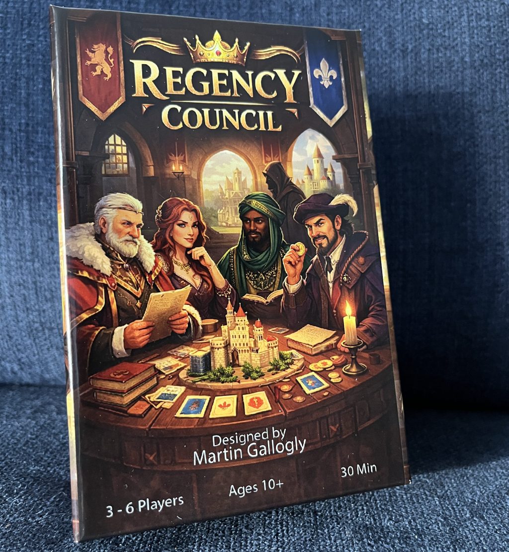 Regency Council is a court simulator game for 3-6 players in which players decide on how to act on events that occur around the castle and the kingdom, using their decisions to advance their status on the council. All the while, players will use plots to discredit their rivals or advantage themselves. When the moment is right, one player will attempt to seize power for themselves, and when the dust settles, a new monarch will be crowned!
